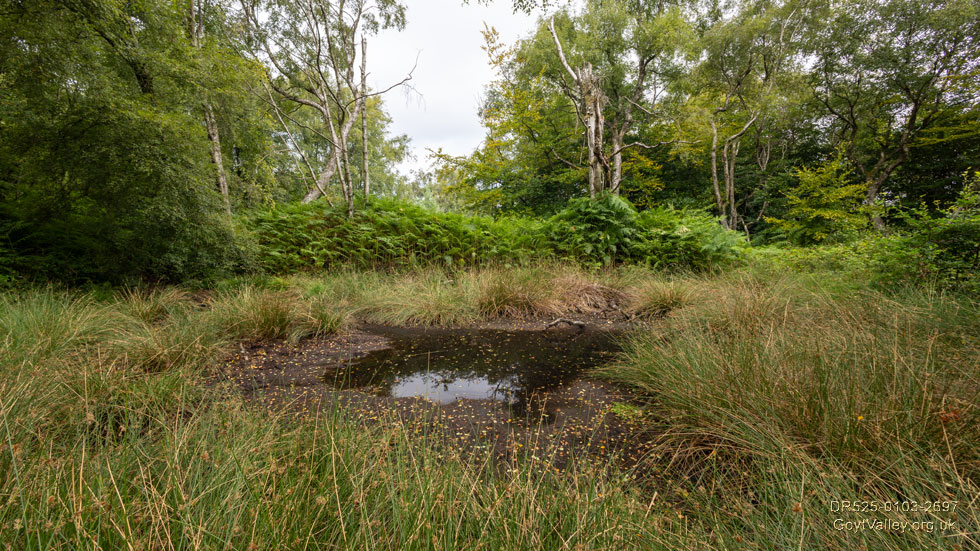 A depleted Pond No: 5 but not in danger of drying out given the tree cover. This pond is kept topped up by a stream and then loses water at the other end. This stops it becoming too turbid: Auguist 16th. 2025 |