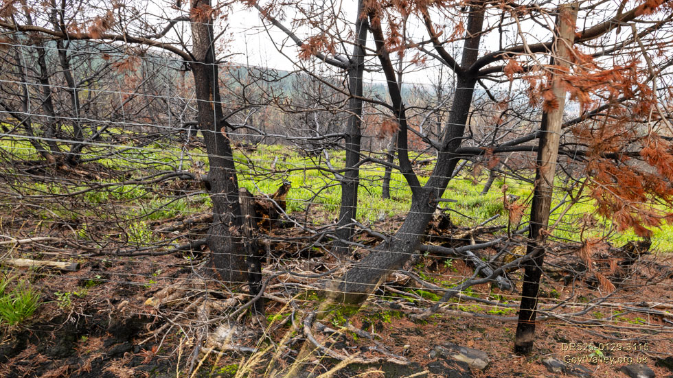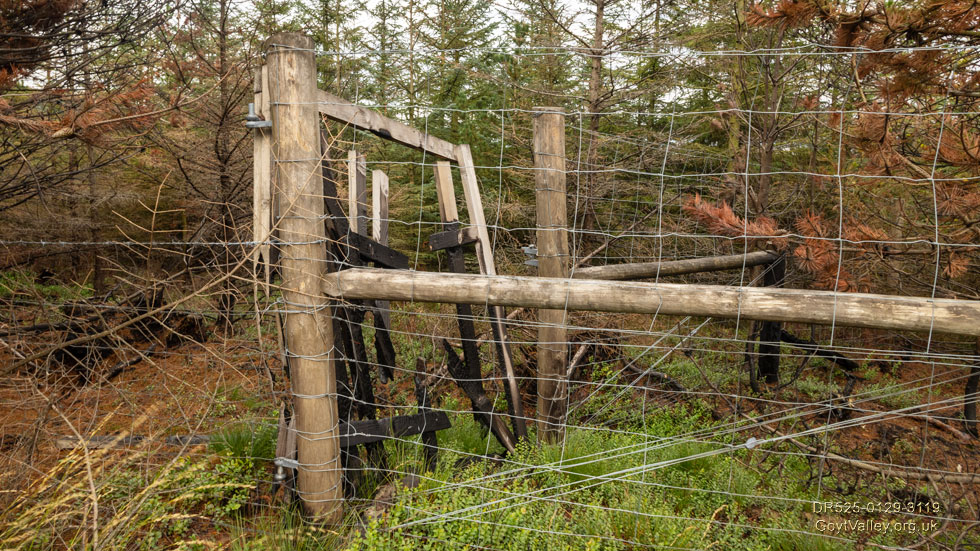 On the ascent to Stakeside, evidence of a fire-ravaged moorland (May 2025) and infrastructure below the tree line. Here the double height stock fence and gate were always in pristine condition and the gate is almost lost. Eyes right as you ascend. More images of fire below: October 2nd 2025 |