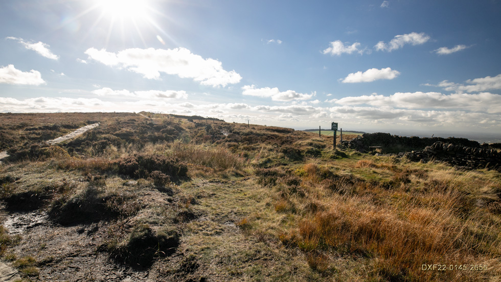 Looking up the trail to Shining Tor with the Lamaload Reservoir sign on the right. Only 150 metres to Shining Tor: October 18th. 2022