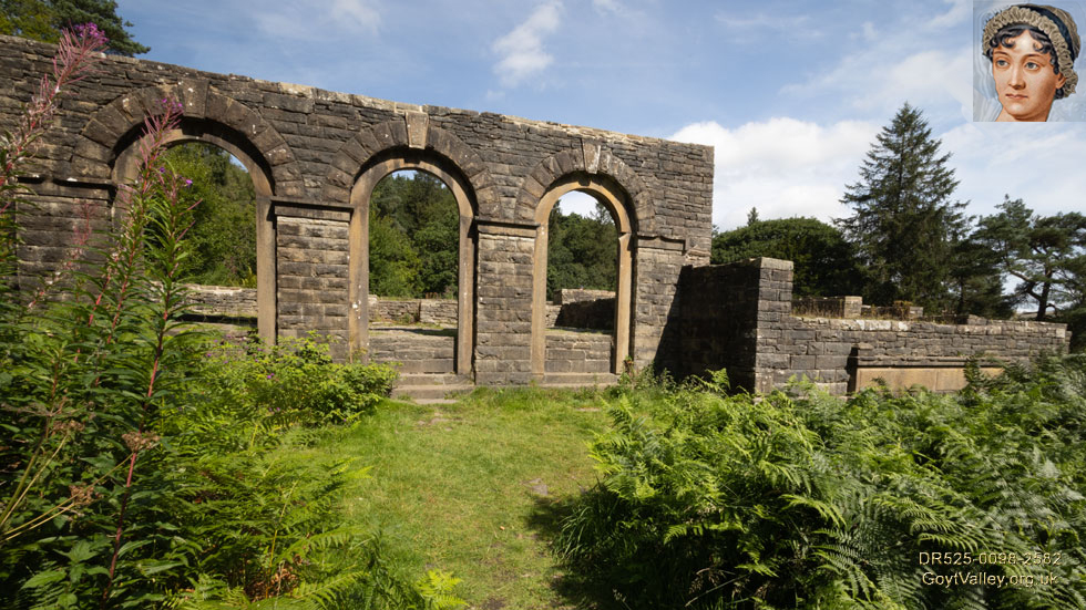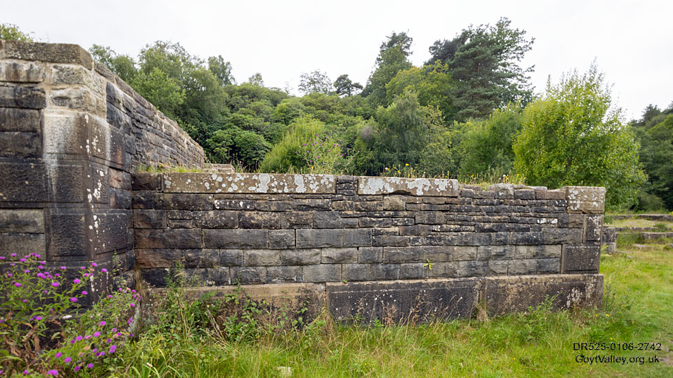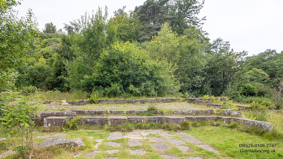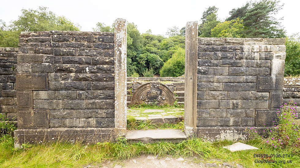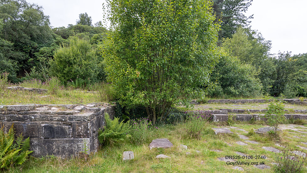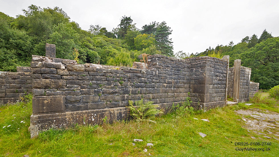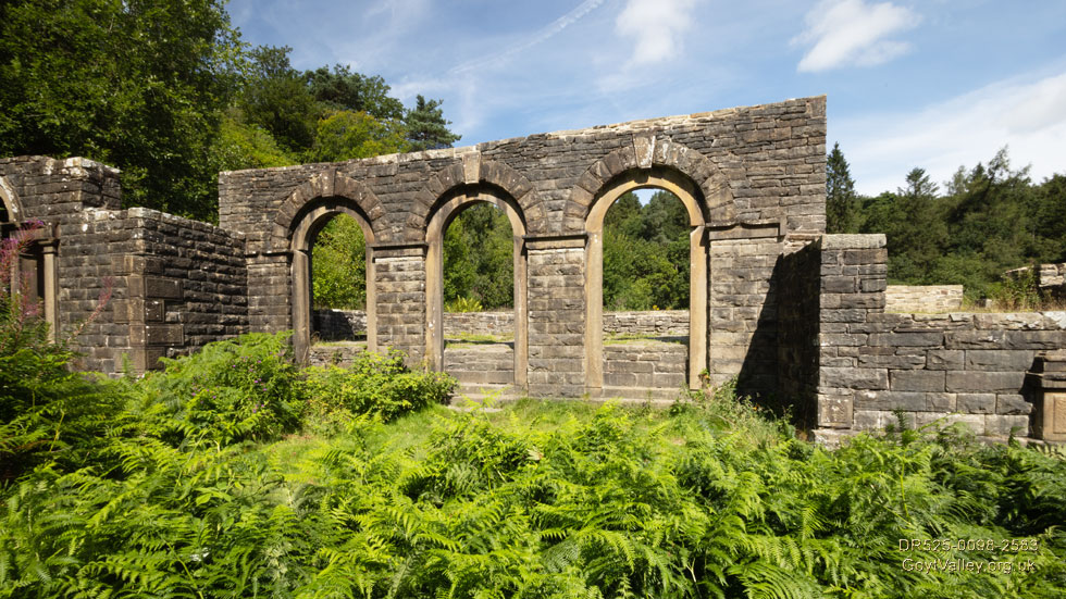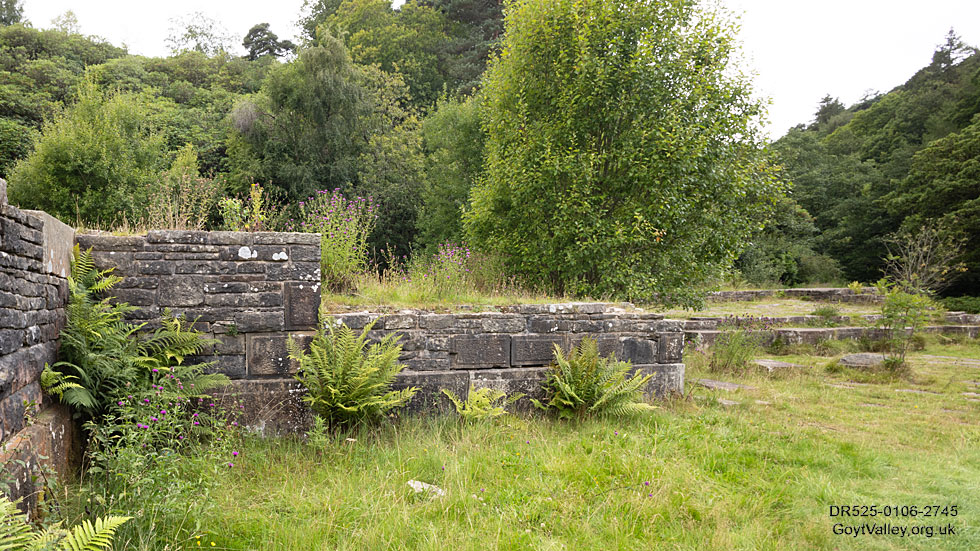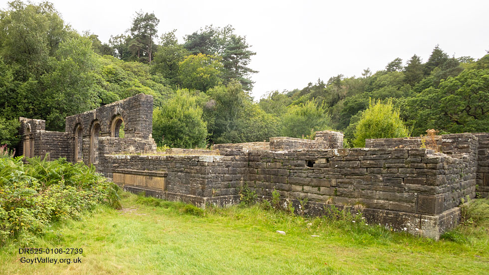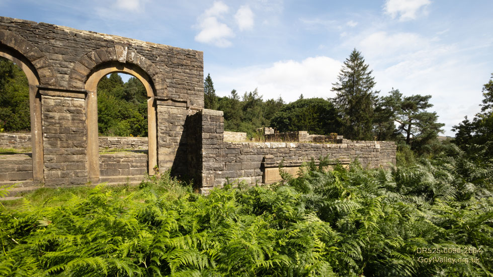 When I see Errwood Hall I always think of Jane Austen and her tragically short life. That life ended only a few years before Errwood Hall was built, which in turn had a short life of less than 100 years. Dense vegetation prevents useful shots but only scraps remain anyway. You can see a foundation plan of Errwood Hall and immediate surroundings on this Derbyshire CC map (IMG) and that may help you to understand the images. I assume we always begin with the East elevation perhaps, as that is the most visually appealing of what little remains. |
