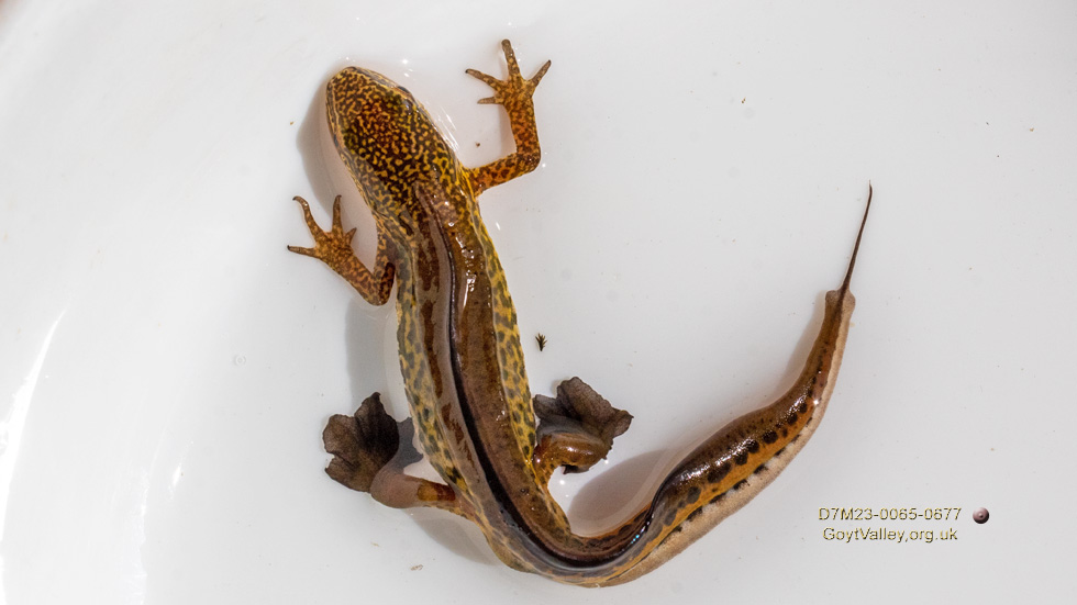Male at pond number 2 (see Route 1) photographed in a dish and then released. Note rear feet and tail filament: May 25th. 2023 |