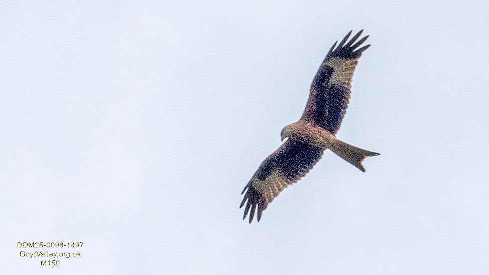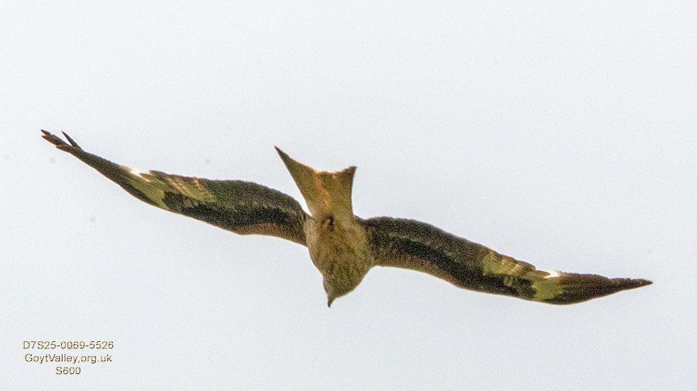 For a long time many people have been telling me they have seen the Red Kite but I had no recollection of ever doing so. Having seen this one today, I can say I doubt I have seen it before. It is a terrible image, yet I make no apologies for that. However, it is good enough for a record, my main purpose. I was as usual hunting insects at the time and this swooped over an adjacent steep rise, taking us both by surprise in a relatively remote part of the Goyt. I snatched the hood off my lens, lifted, pointed and shot. I was lucky to get even this as it quickly changed direction and moved away. It is unmistakably the Red Kite: June 4th. 2025 |