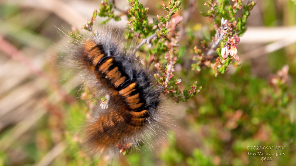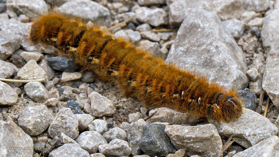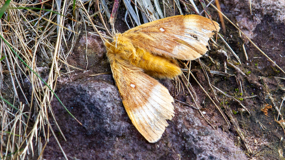 | The first of two adult Oak Eggars I ever saw. This one deceased. The second was struck by an Emperor Dragonfly mid-flight and became the Emperor's lunch: July 21st. |