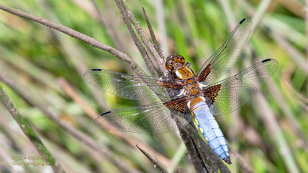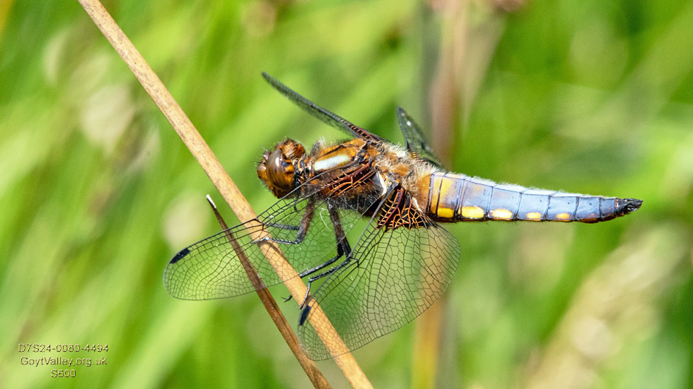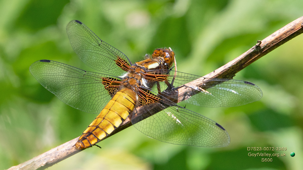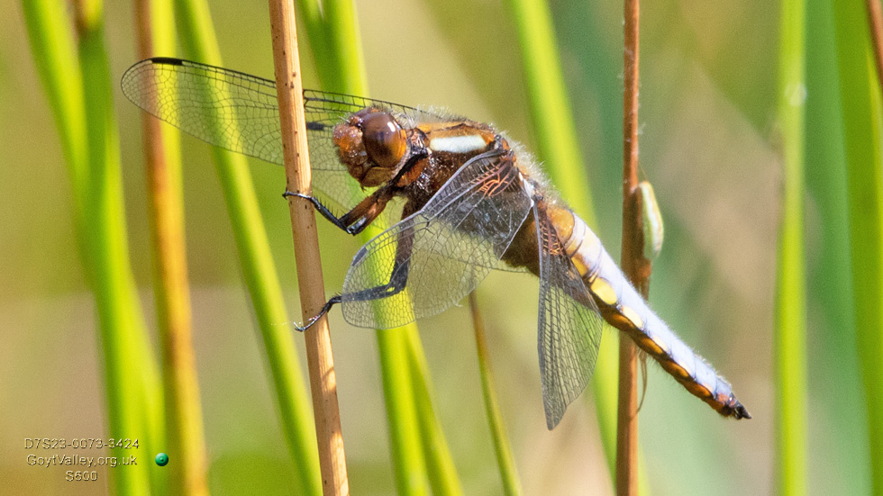 Another genuine Goyt Valley image and this male illustrates a difficulty with shooting Dragonflies, given the awful background. There is a need to get low down so you can avoid density of background if possible. where there is time to plan and the physical possibility, some minor gardening can be carried out first in the area behind a proposed shot. The males tend to linger at ponds. The females hide in bushes when not mating or ovipositing. It is however, for my pusposes, proof of sighting and breeding at the pond: June 25th.