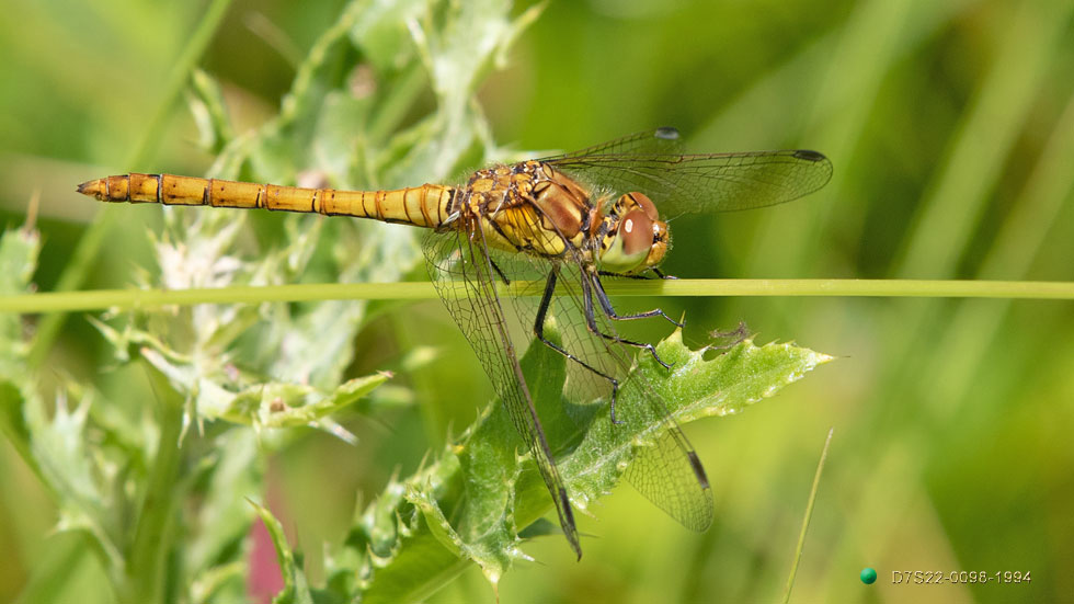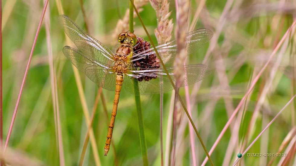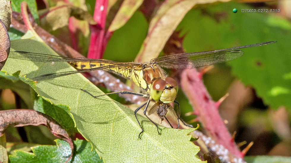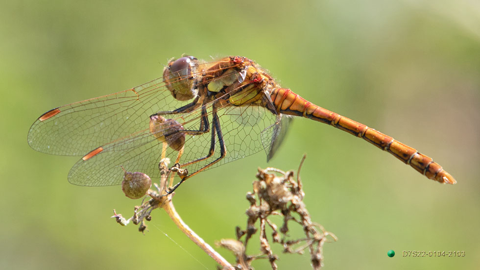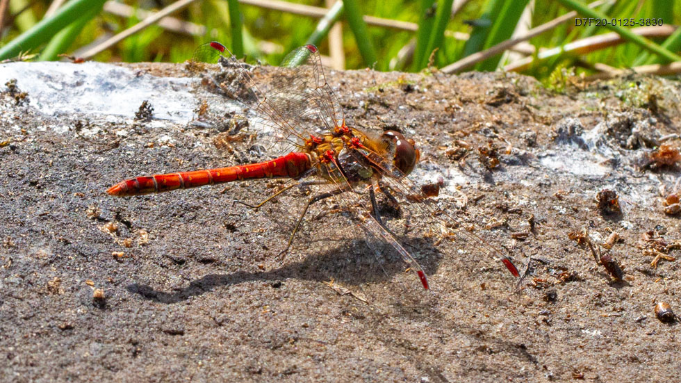 Bigger, but not much, than the Black Darter this is another late season Dragonfly which can be seen anywhere there are Dragonflies. Males in particular (like this one) have a penchant for firm ground, though they will be seen anywhere. Also very fidgety like the Black Darter. Forever taking off and landing. Easily mistaken for the Ruddy Darter which to the untrained eye looks identical. The Common Darter has a faint light coloured stripe down each leg, which can be seen on the original huge RAW image. The body is far more red on the Ruddy Darter and the abdomen swollen