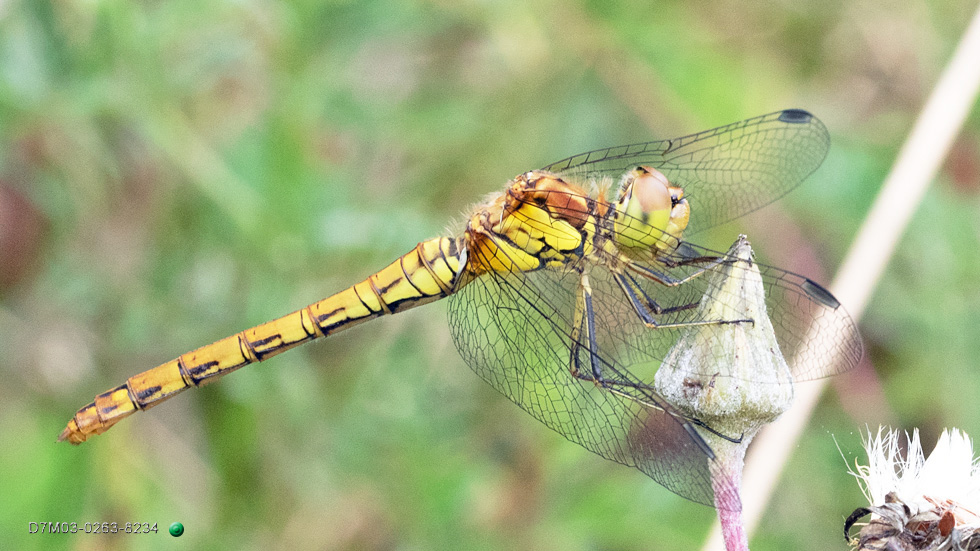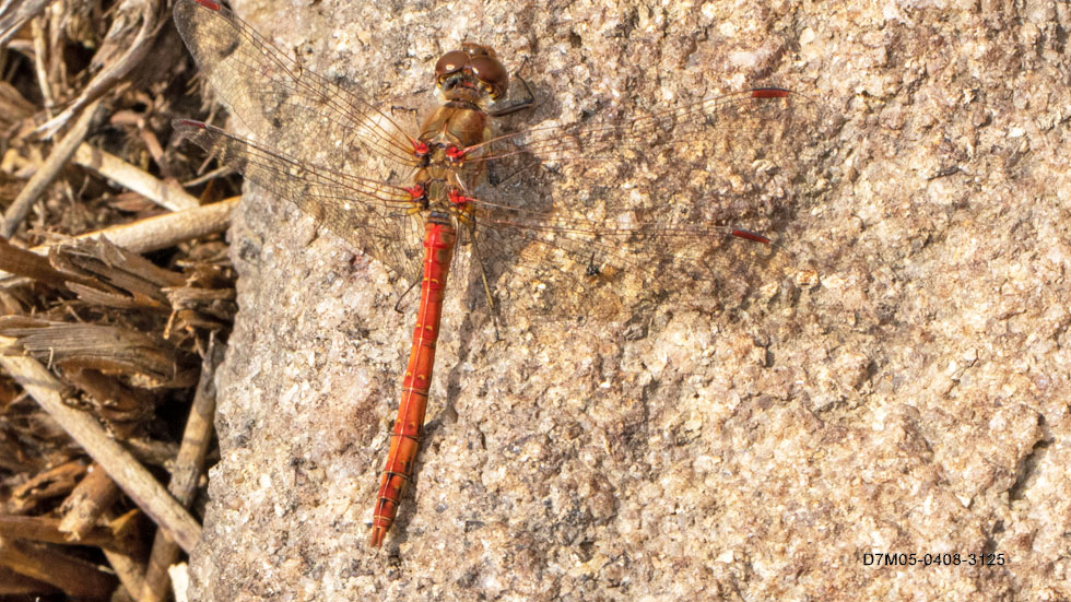 Female. Note the diagnostic light stripe down each leg which helps distinguish it from the Ruddy Darter: August 25th.