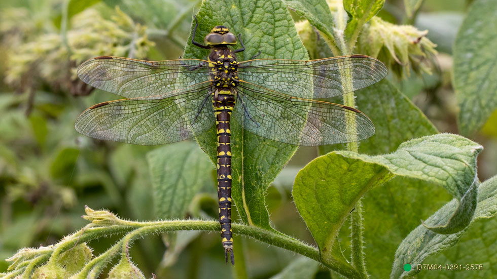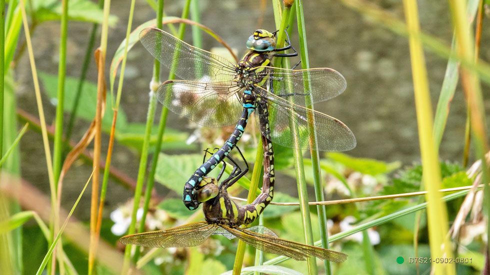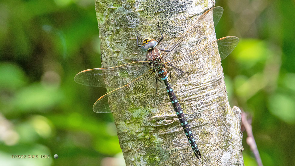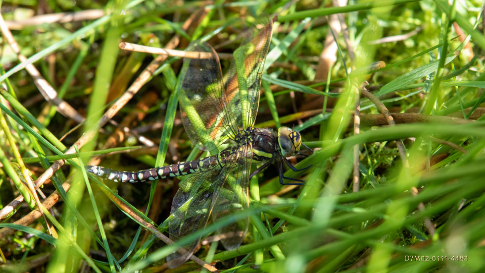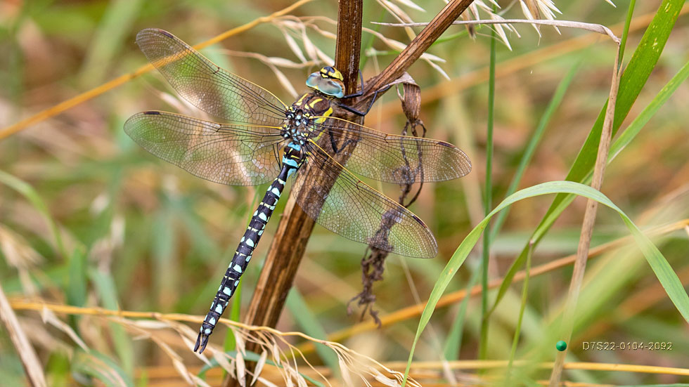 Note carefully the end of the abdomen. In the similar Southern Hawker species, the last two pairs of dots are actually joined continuously to form two distinct yellow bands (no gaps) around the abdomen. That is diagnostic: August 1st.