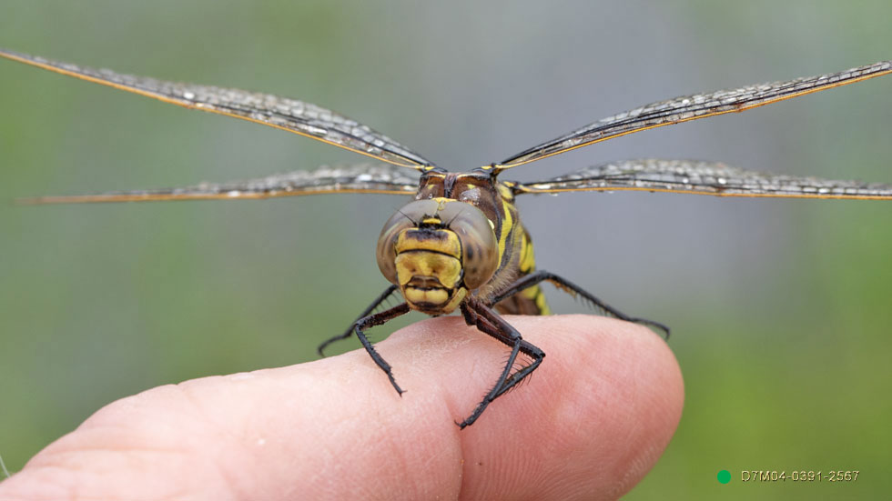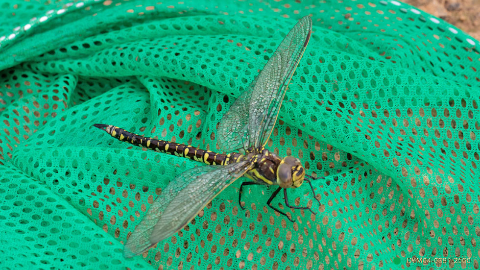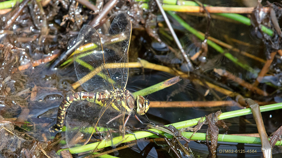 This one landed in a bad place and was pulled under the water. A pond weed that acts like quicksand to Dragonflies. I was in time to net her and painstakingly clean her up without pulling a wing off etc. A blow dry next: August 1st.