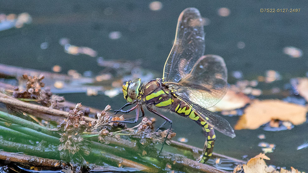 Terrible image but a good record. Did not expect to see this female ovipositing at pond number five (see route two). Dim and dismal under that tree canopy over the turbid water, which offers a poor photography backdrop. Still plenty of water despite the drought. Too protected under there. Note the distinctive and diagnostic yellow costa on the wing edge. Also the similar Southern Hawker never ever oviposits directly into water: August 31st. 2022.