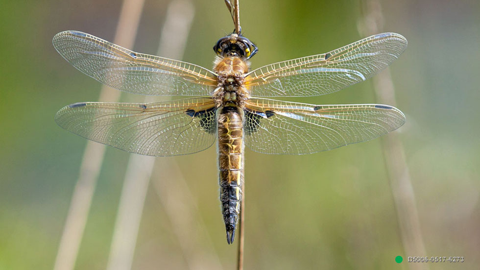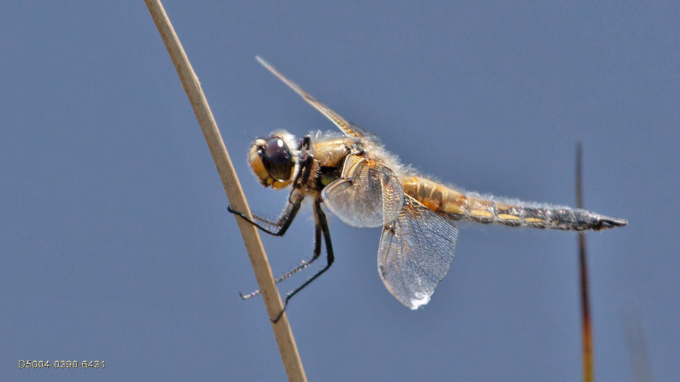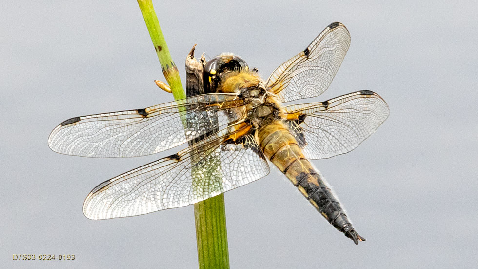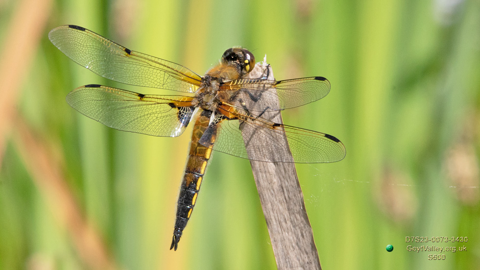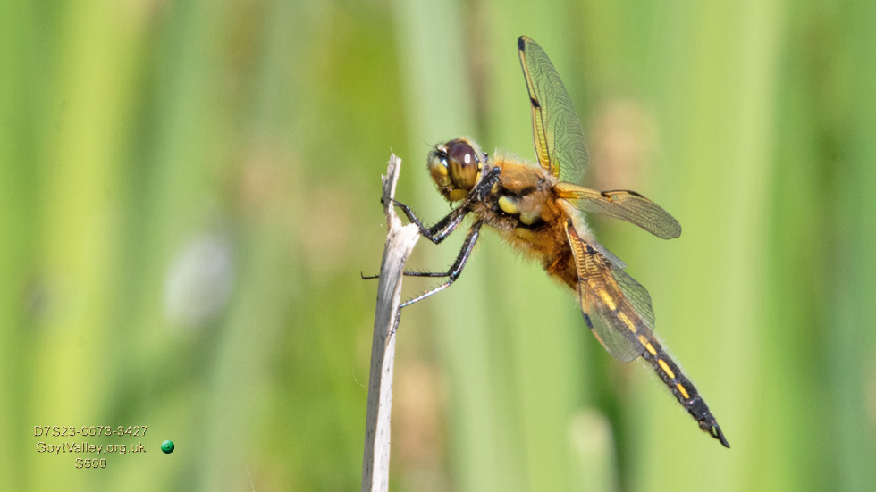 A full frontal image to show this has eight spots, not four, which confuses people. It is however a distinctive Dragonfly. Other Dragonflies have one spot on each of four wings, hence they have four spots which can cause confusion. This species is constantly lifting off and landing. Usefully they usually return to the same safe harbour each time with food to eat (flies) when hunting. Incidentally this insect is what they term a 'Teneral' or immature. It had not long since emerged and the insect was still developing. Almost there but not quite. Often eye-colour is last to form: June 16th.