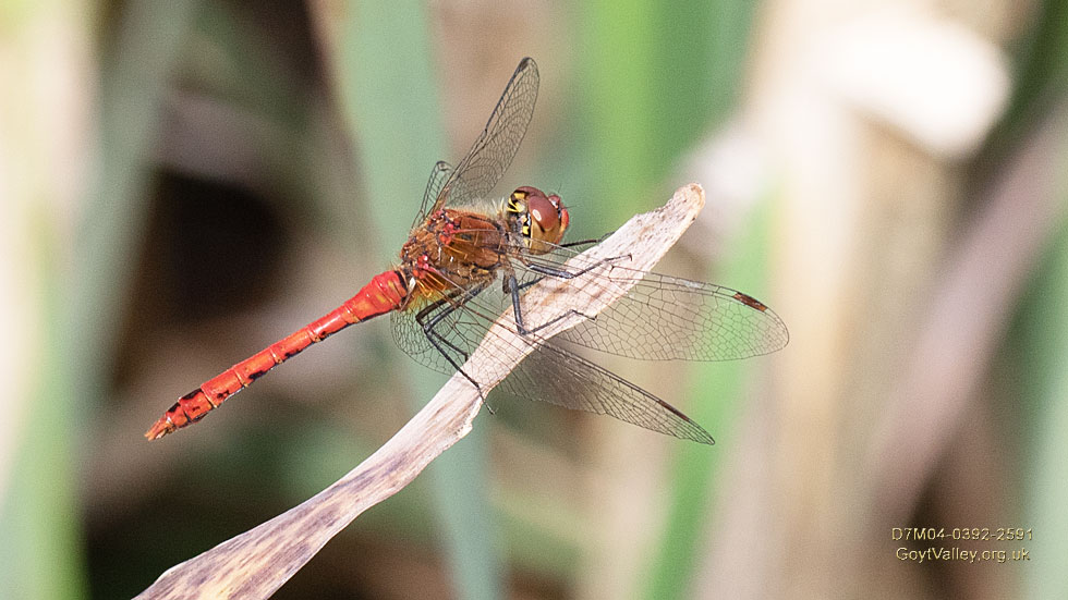 Declaration: For the record I do not claim to have seen or heard of this species in the Goyt Valley. It is however well within range and very close by. I positively identified it in the general area but it is hard to identify. Close contact (with a lens) essential. Superficially almost identical to the Common Darter but far less common. The ruddy red colour much stronger and consistent. Viewed from above (essential) the abdomen is clearly bulbous and swollen compared to the Common Darter. |