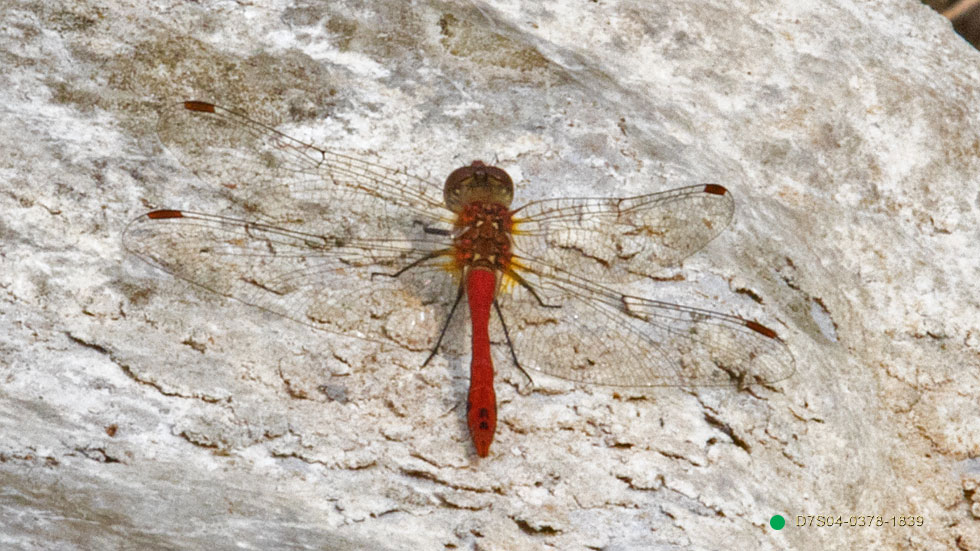 Note the heavily bulbous abdomen, not shared by the Common Darter. Also more solidly red. (I have a far superior images of the back somewhere when I come across them): July 16th. |
