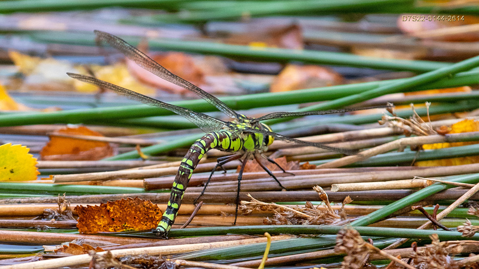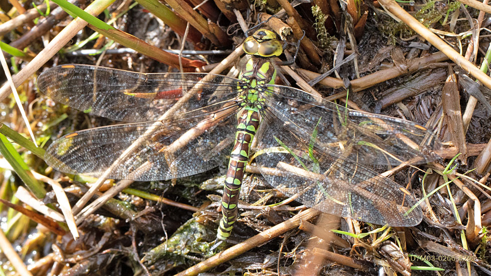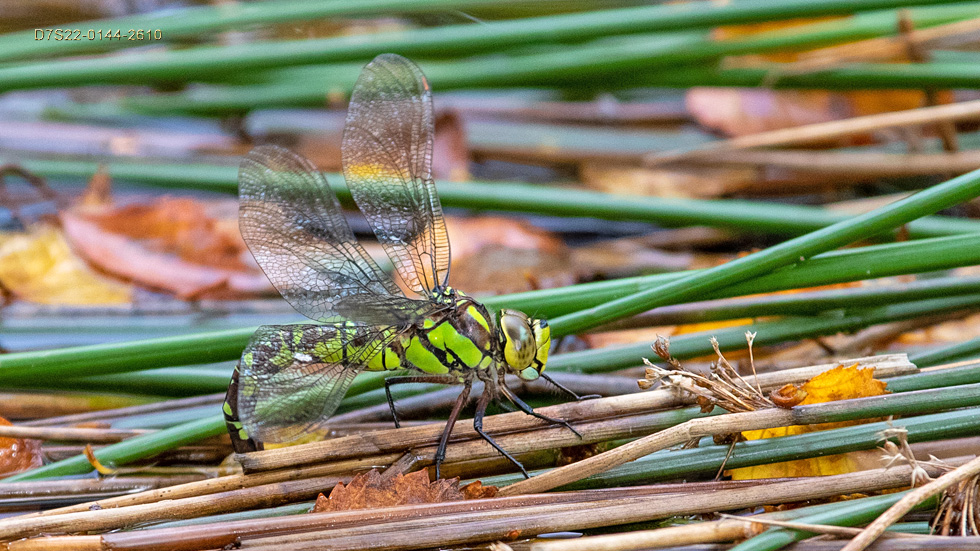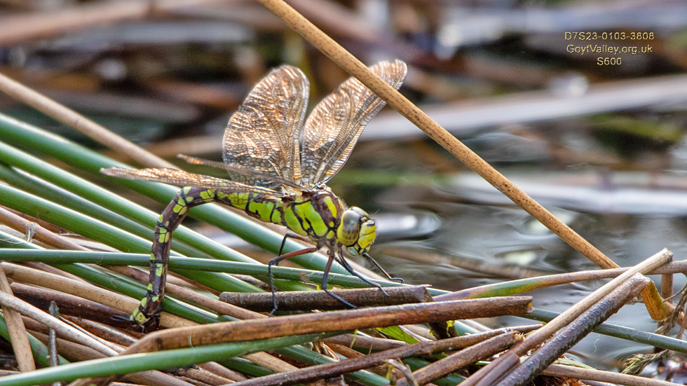A hugely significant (for me) sighting at Pond Number 5, where I have rarely seen Dragonflies but they must be there. A 12 degree day late in the year and this female ovipositing. Roll over image to see a context shot. The Southern Hawker female never gets her abdomen wet when ovipositing. This image seems to contradict that but the context image confirms she is sat on a solid blanket of fallen reeds: October 16th. 2022