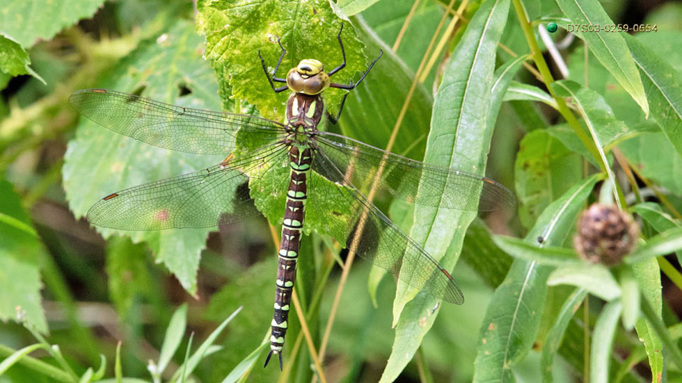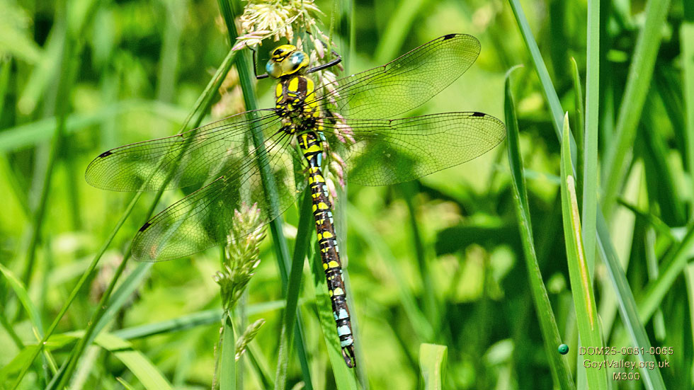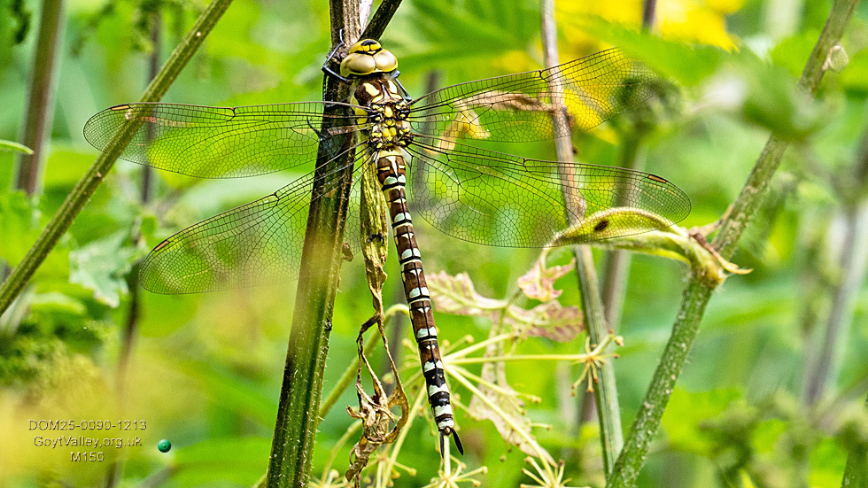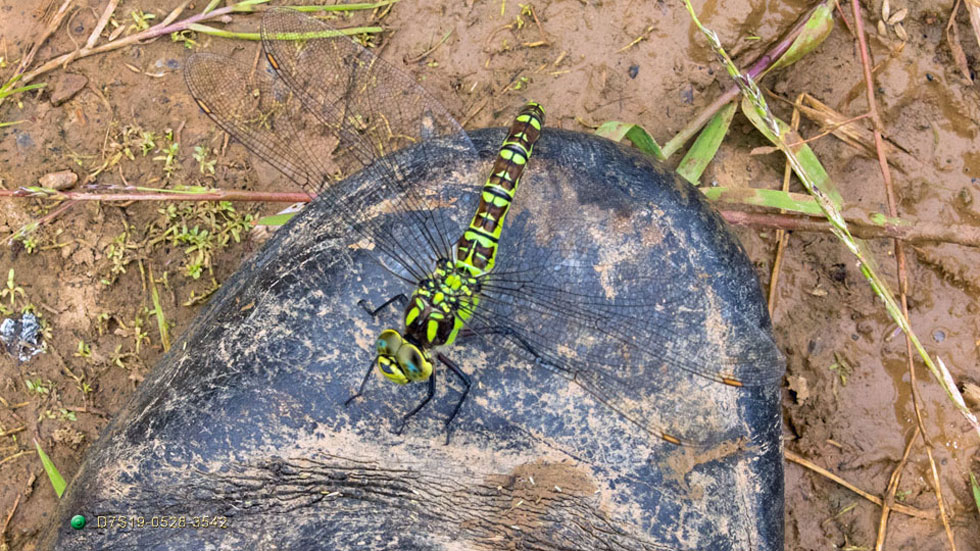 As stated above the Southern Hawker never (ever) gets her abdomen wet when ovipositing, They prefer a rock but if pushed will cling to vertical vegetation on the bank. This one landed on my boot when I stood in the shallows. I had plenty of time to shoot and fortunately carry two cameras, one I can use at close quarters. Question is, why has this species alone evolved this way. It is probably the most common large Dragonfly in areas where I operate, over a wide range. Perhaps its strategy is more successful: July 22nd.