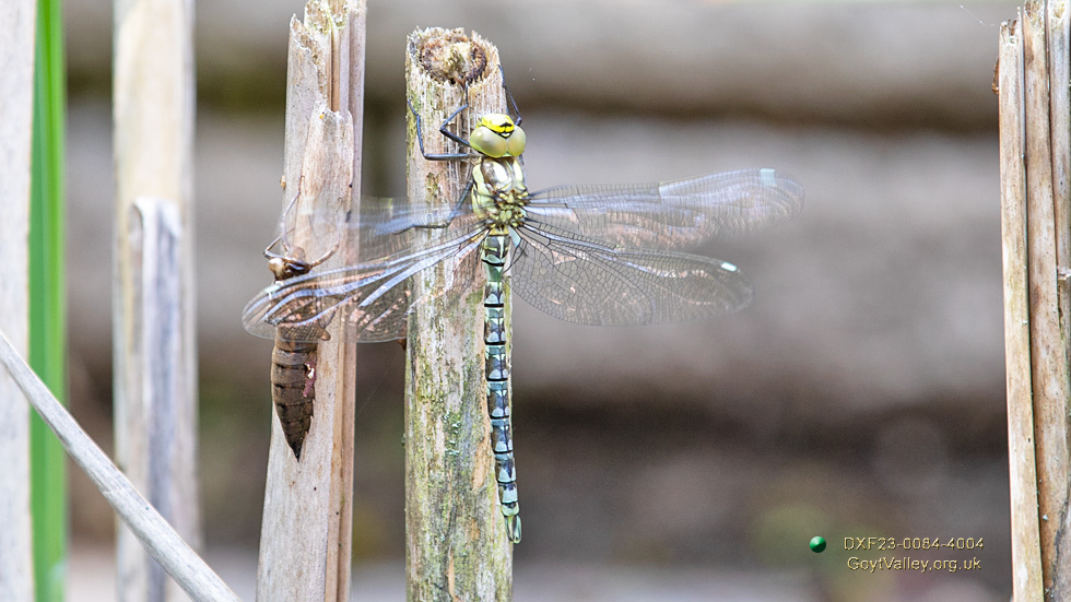 A teneral (immature) which I spotted on my own pond while I was remodelling my rear garden. Grabbed my kit, fired off one shot then it took off. One minute later and I would never have seen it. It will have flown into a tree to hide while it fully develops. The exuvia is on the adjacent stem: June 22nd. 2023