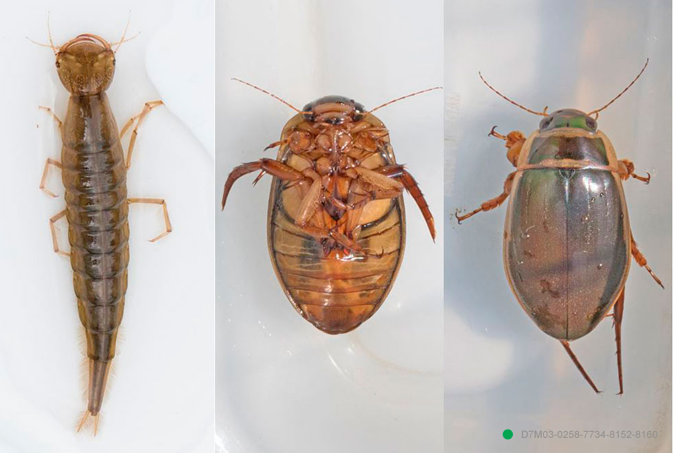 Not everyone's cup of tea but definitely mine. This well known and ferocious water beetle is the scourge of ponds. Seen here at Pond Number 2, these will hunt anything they can grasp and spend a couple of years hunting under water as larvae. They rise every few minutes, poking their abdomen to the surface to obtain a bubble of air. That is when I catch them but you have to be very quick. I need to get some film of one of these in a fish tank: May 18th. |