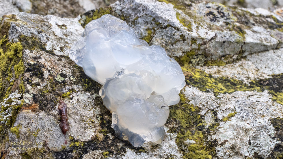 I find this baffling. There are Jelly Fungi that can look like this, in a variety of colours, but all those I have discovered online are invariably on timber. This was found at a gateway on a route I regularly patrol (Route 6 anti-clockwise). This blob appears to be made up of many smaller regular size blobs (sweetcorn size). There were a number of different size patches of this gelatinous mass, all in one small area. On a dry stone wall, not timber. The blobs appear to be sat on lichen but that may be a coincidence. I was drawn to the spot by entrails on an adjacent large diameter wooden gate post. A spot where a Raptor has safely perched having lunch (you can see for miles in any direction). This is a day when I have seen an amazing quantity of sparkling white fresh lichens everywhere. I will check the condition when I return soon which will have to be a week at least unfortunately at the moment as my motor is having planned maintenance. |